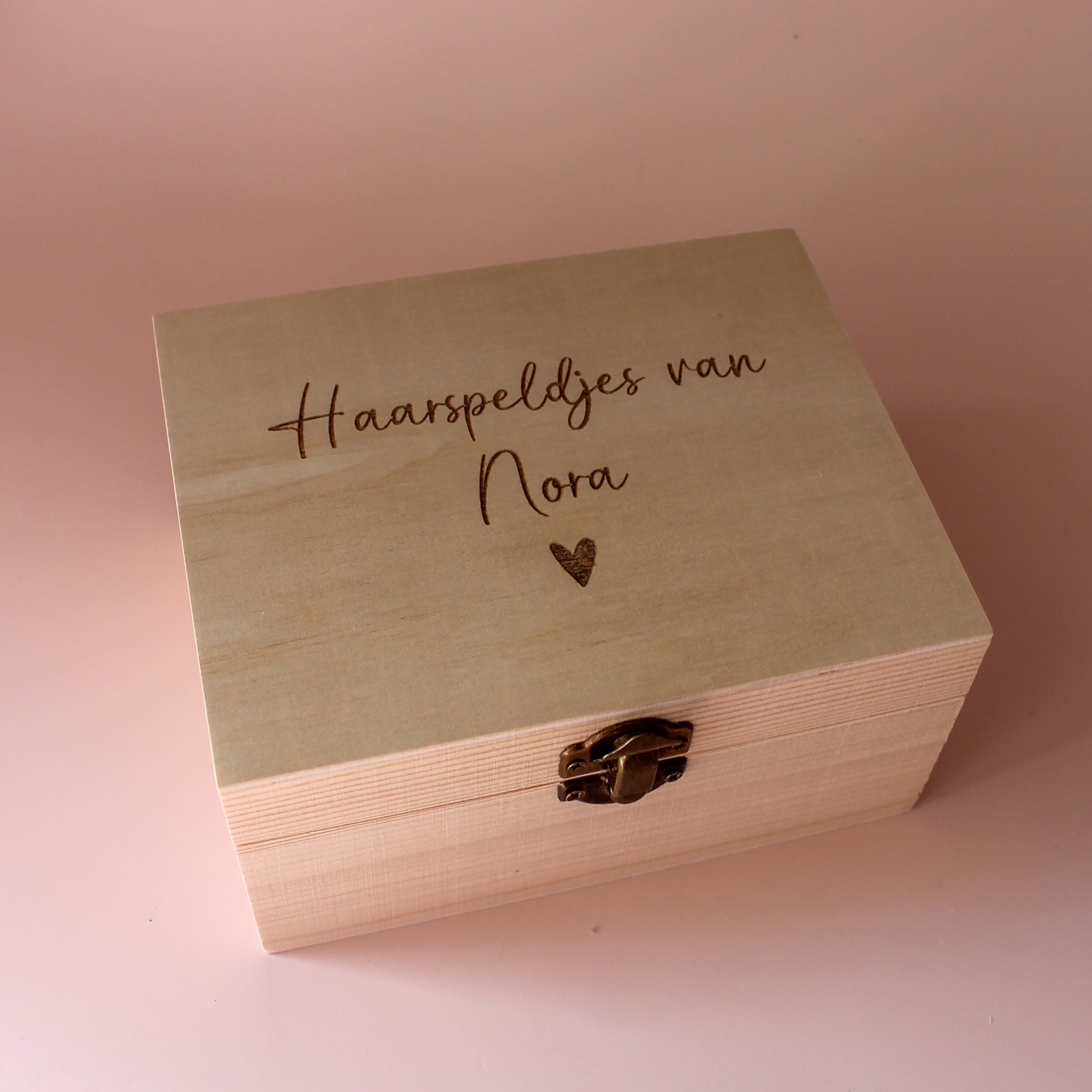 Met het toevoegen van de naam van het meisje, is het bewaarkistje extra persoonlijk. De luxe bewaarkist wordt gegraveerd door Festande - gepersonaliseerde geschenken. Check zeker even hun Insta via deze link voor meer gepersonaliseerde producten :)