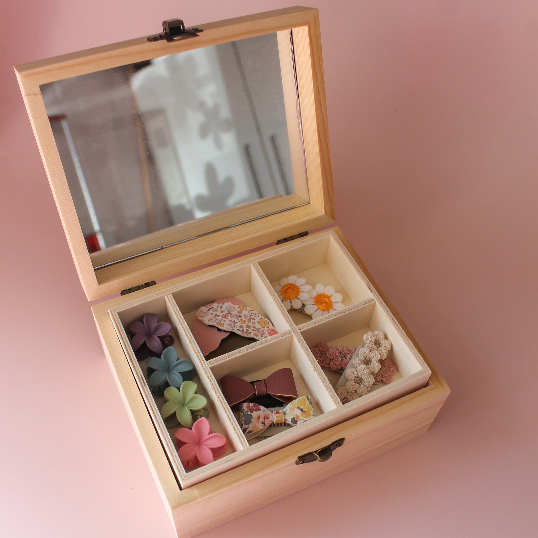 Met deze luxe bewaarkist voor haaraccessoires raak jij de haarspeldjes, haarstrikjes en andere benodigdheden voor het haar van jouw dochter niet meer kwijt! De kist heeft bovenin een uitneembaar vak met 5 kleinere vakken met ruimte voor speldjes, strikjes en elastiekjes. In de functionele vakken er onder is ruimte voor nog meer mooie haaraccessoires. Is het haar gedaan? Bekijk samen het resultaat in de spiegel die in de binnenkant van de deksel verwerkt zit!